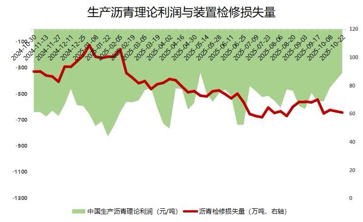 据隆众资讯,截至10月22日当周,按当前原料价格测算,生产沥青综合利润周度均值为-337.5元/吨,环比增加56.6元/吨。近期国际原油维持弱势震荡,原料成本支撑减弱,沥青价格跌幅低于原料,周度利润均值有所好转。同期,国内沥青装置检修量为61.6万吨,较上周下降0.9万吨,降幅1.4%。齐鲁石化、江苏新海转产渣油,加之无棣鑫岳停产沥青以及山东胜星、广州石化停产检修,带动损失量增加。