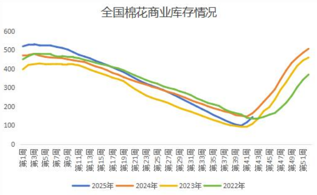 据Mysteel,疆内采收进度快于去年,轧花厂皮棉加工量持续增加;市场保持刚需补货为主,下游纱市场表现一般,企业备货积极性不高。随着新棉集中上市,全国商业库存继续呈现增长态势。据Mysteel调研显示,截止2025年10月17日,棉花商业总库存143.34万吨,环比上周增加27.80万吨,增幅为24.06%。其中,新疆地区商品棉94.44万吨,周环比增加29.74万吨增幅为45.97%。内地地区商品棉17.02万吨,周环比减少2.75万吨,降幅为13.91%。