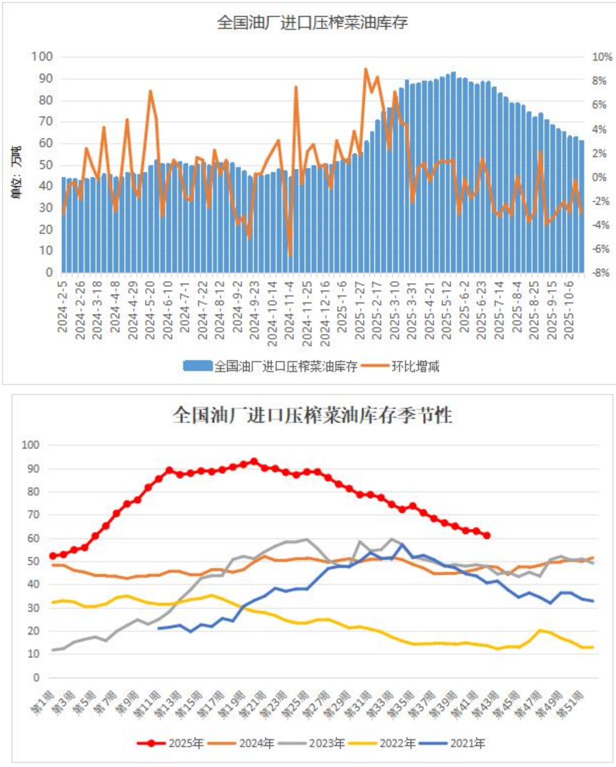 上周菜油产量略有增加,但由于国内港口菜籽现货供应持续收紧,油厂开机率整体上处于几乎停滞水平,短期菜油供给端的瓶颈依旧存在,支撑菜油持续去库。机构监测数据显示,截止到2025年第42周末,国内进口压榨菜油库存量为61.0万吨,较上周的62.9万吨减少1.9万吨,环比下降2.95%;合同量为3.9万吨,较上周的5.1万吨减少1.2万吨,环比下降24.11%。