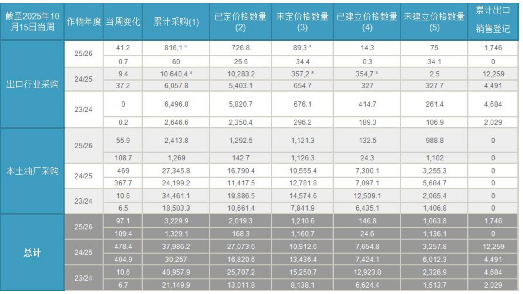 截至10月15日,2024/25年度大豆累计出口销售登记数量为1225.90万吨,2025/26年度大豆累计出口销售登记数量为174.60万吨。