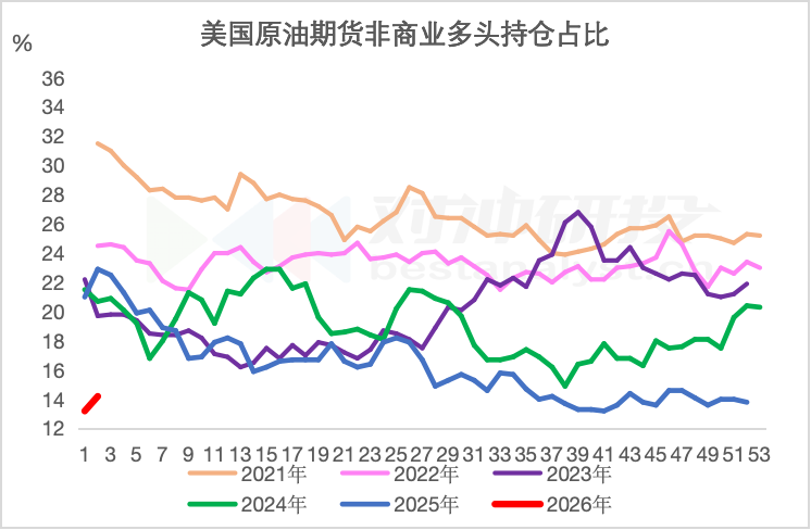 据CFTC,截至1月13日,CFTC美国原油期货非商业多头持仓286136(+27180)张,空头持仓228008(+26404)张,净多头持仓58128(+776)张。非商业多头占比14.2%,周环比增加1个百分点。