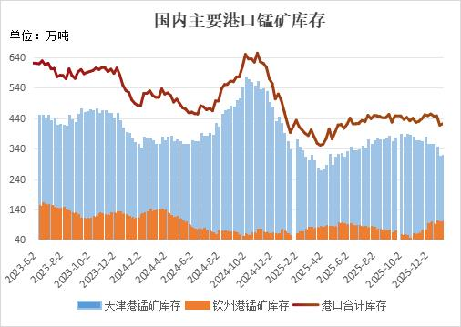 据Mysteel,近期中国主要港口锰矿到货量有所增长,下游需求承接变化不大,港口库存出现小幅累积。截至1月16日当周,天津港港口锰矿库存为318.1万吨,环比增长1.9万吨;连云港港口锰矿库存量为0.5万吨;钦州港港口锰矿库存量为103.2万吨,环比增加2.4万吨。目前港口锰矿库存量总计为421.8万吨,较上期增加4.3万吨。