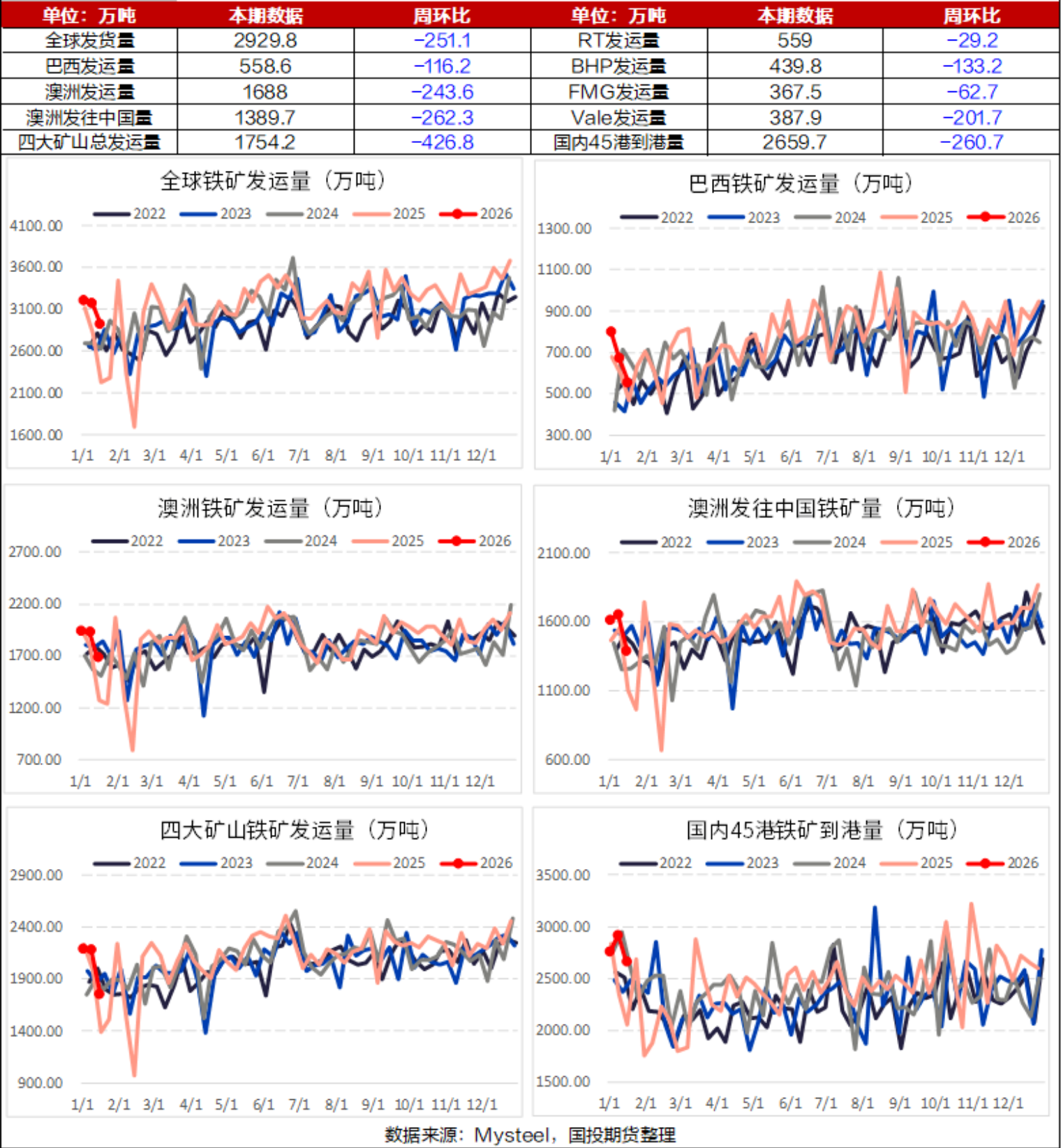 2026年1月12日-1月18日,全球铁矿石发运总量2929.8万吨,环比减少251.1万吨。澳洲巴西铁矿发运总量2246.6万吨,环比减少359.8万吨。澳洲发运量1688.0万吨,环比减少243.6万吨,其中澳洲发往中国的量1389.7万吨,环比减少262.4万吨。巴西发运量558.6万吨,环比减少116.2万吨。