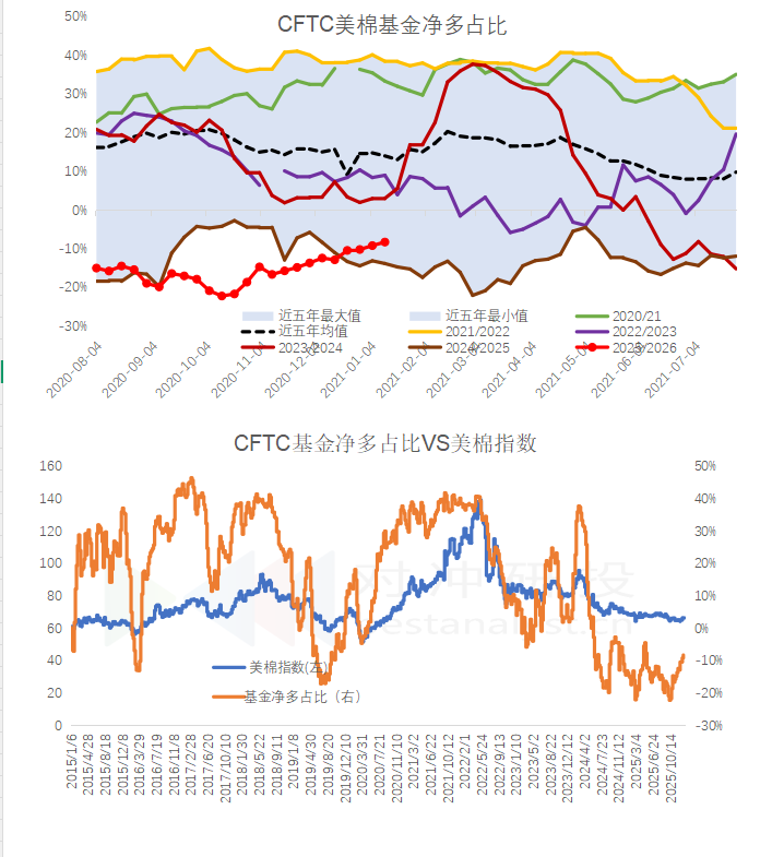 CFTC美棉基金:截止1月13日仅期货非商业基金净多占比增至-8.4%,连续第四周增加
