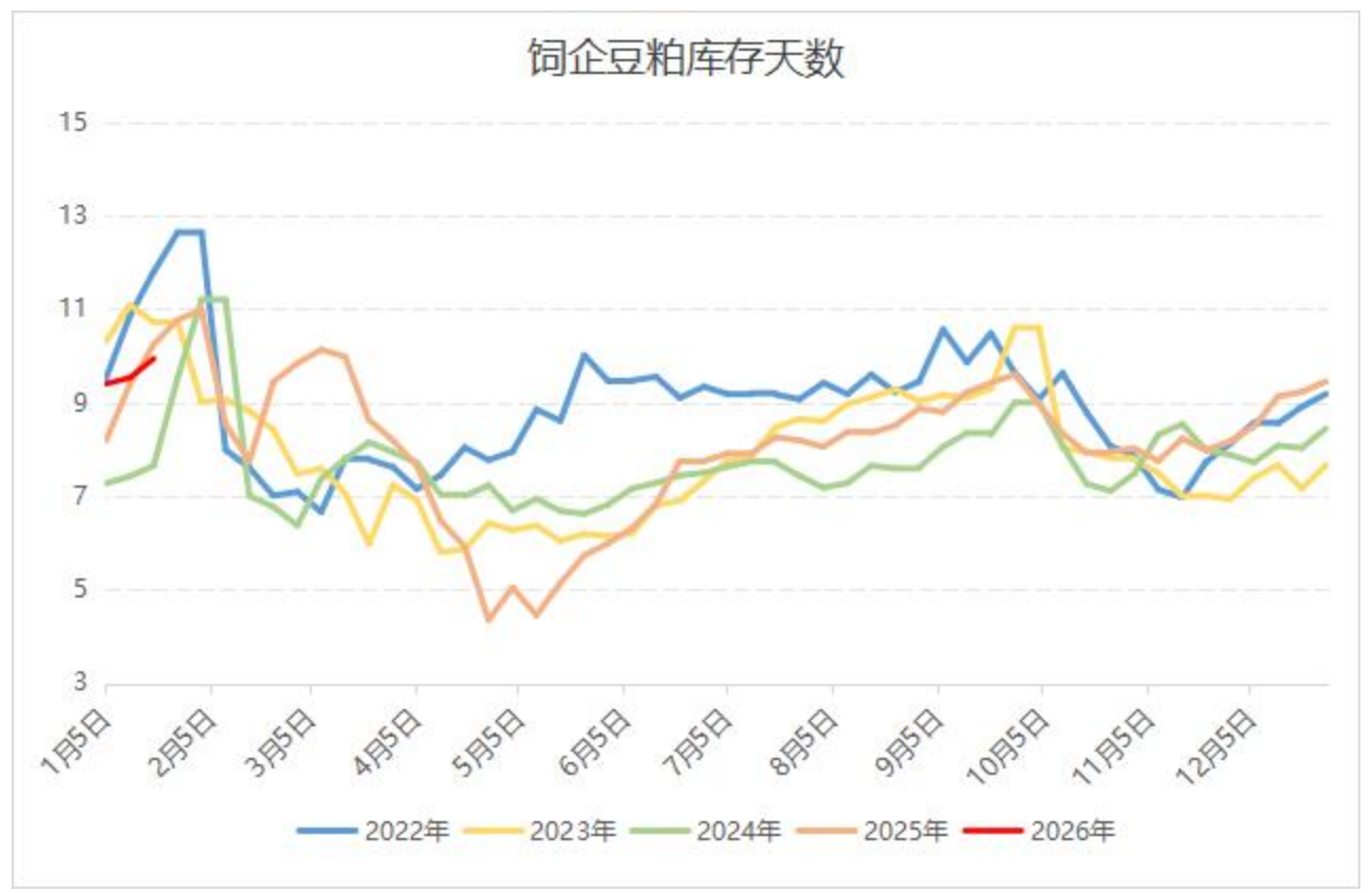 上周国内饲料企业物理库存各地大多有所上升,全国小幅增加,其中鲁豫、东北及华北等市场增幅较大。具体分析,国内油厂开机表现延续平稳态势,油厂去库节奏提升有限,豆粕库存承压依旧,催提现象仍较多见;下游饲料需求表现稳定,饲料企业刚需滚动补库为主,而随着年关将近备货窗口期缩短,年底备货节奏稍有加速,库存天数小增为主。不过四川及广西市场部分地区饲料厂因前期到货量较为充足,故而近期库存天数有所减少。据Mysteel农产品对全国主要地区的50家饲料企业样本调查显示,截至1月16日(2026年第3周),全国饲料企业豆粕物理库存9.94天,较上一期增0.41天,较去年同期减0.31天。