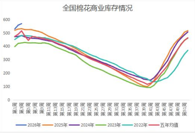 据Mysteel,公检进度快于往年,棉花加工企业积极销售,货源更多向贸易环节转移。下游纺企中高支纱线订单表现稳定,多选择刚需补货,部分地区仓库库存小幅下降,出库较上周略有放缓。据Mysteel调研显示,截止2026年01月16日,全国棉花商业库存为568.63万吨,环比上周增加11.33万吨,增幅为2.03%,高于同期水平。其中,新疆地区商品棉470.63万吨,周环比增加2.22万吨,增幅为0.47%。内地地区商品棉53.3万吨,周环比增加4.36万吨,增幅为8.91%。