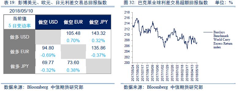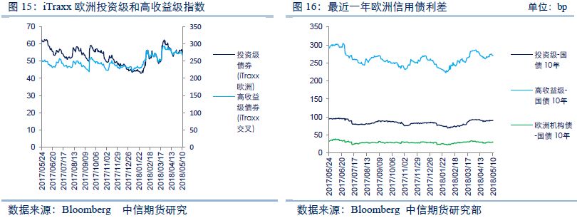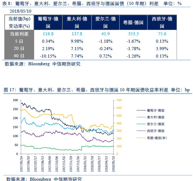葡萄牙、意大利、爱尔兰、希腊和西班牙这五个欧洲国家由于经济发展缓慢和债务危机,持续引发市场对它们的关注,尤其是国家主权债部分。我们对比了这五个国家和欧洲经济发展较好的德国的10年期国债,通过收益率利差观察这五个国家的信用风险水平。本周,德国和意大利的10年期国债收益率利差进一步扩大至1.37%,涨幅显著高于其它国家。早前意大利新政府组阁第四轮磋商失败,现在五星运动和北方联盟有意就组建执政联盟进行最后谈判,这表明意大利反建制政党联合政府或可能上台,意大利政府面临不确定性风险。