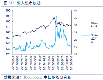 我们选取MSCI亚洲指数和日经225隐含波动率指数来观察亚太地区股市整体情况。本周,MSCI亚洲指数上涨1.57%,日本股市波动下跌2.64%,香港股市波动周度下跌9.08%。