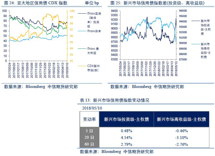 亚太信用市场的观测同样从货币市场、信用债市场和利率互换市场的角度进行分析,包含了日本、香港、中国大陆、新加坡、印度和澳大利亚六个地区。本周,中国央行累计开展1300亿元逆回购操作,因本周累计有2700亿元逆回购到期,实现净回笼1400亿元。市场资金面方面,尽管央行连日来保持净回笼态势,资金面仍延续了宽松态势。下周将进入5月主要税种的清缴入库高峰,叠加政府债券发行放量,预计流动性面临一定的行政性回笼压力。日本方面,日本央行前高官“强硬鹰派”木内登英本周接受媒体采访时表示日本央行许多决策者已立志于退出超宽松货币政策,并且如果经济持续复苏,他们或还将支持升息。利率互换方面,日元和人民币的2年期和10年期利率互换利率均上行,日元2-10年利差走陡4.74%,人民币2-10年利差收窄5.56%。中国4月CPI同比上涨1.8%,低于预期1.9%,不及前值2.1%。信用债方面,iTraxx日本指数周度上涨1.12%,iTraxx亚洲(除日本)指数上涨0.32%,iTraxx澳大利亚指数下跌1.11%,CDX新兴市场指数下跌0.01%。近期中国债务违约事件频繁,中国债市的信贷利差飙升至两年新高,低评级品种尤其是民企面临持续重压。