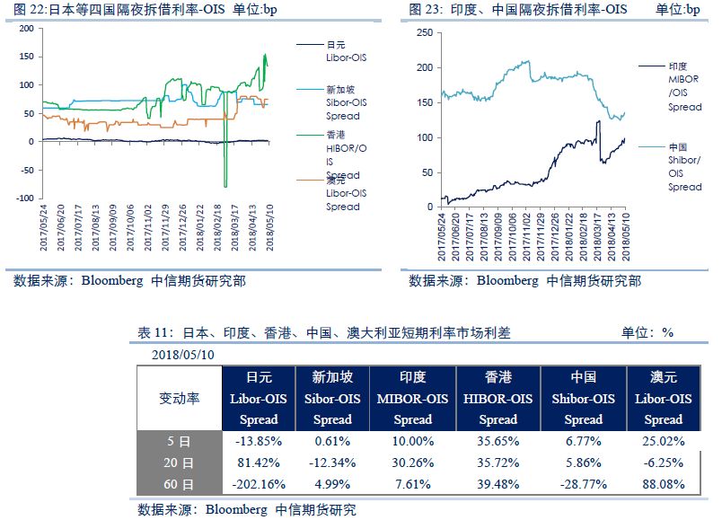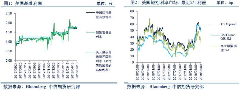我们通过Libor, Overnight Index Swap(隔夜指数互换)和商业票据利率进行美国货币市场观察。本周,美国公布4月CPI数据,整体不及预期:4月CPI环比0.2%,核心CPI环比0.1%,均不及预期;4月CPI同比2.5%符合预期,核心CPI同比2.1%不及预期。尽管当前通胀没有明显提升,但市场对于美联储6月加息的预期仍然维持高位。货币市场利差高企的情况本周继续回落,TED Spread和Libor-OIS分别下跌至47.83bp和48.73bp,月度收窄20%和16%。