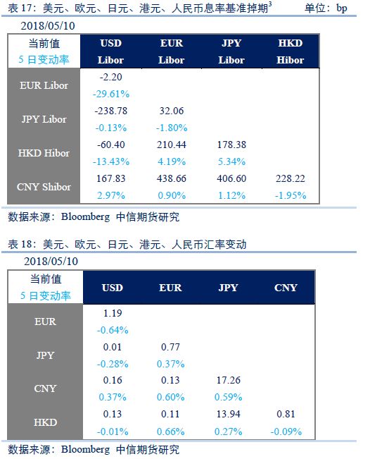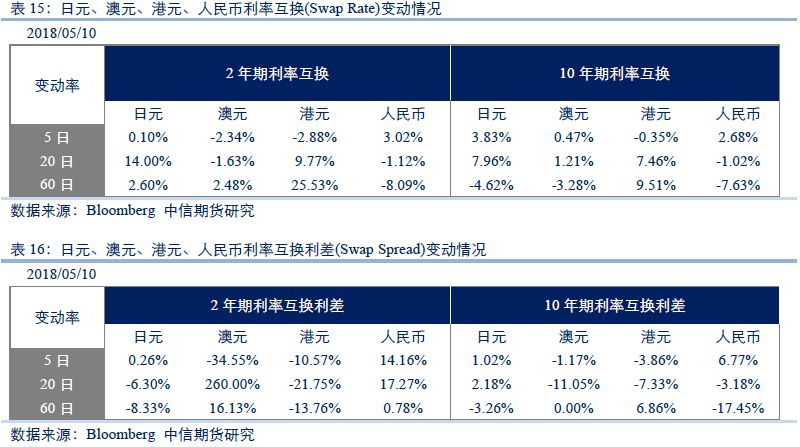 在利率互换方面,我们观察了日本、澳大利亚、香港和中国的合约利率水平。本周,日元和人民币的2年期和10年期利率互换利率均上行,日元2-10年利差走陡4.74%,人民币2-10年利差收窄5.56%。中国4月CPI同比上涨1.8%,低于预期1.9%,不及前值2.1%。4月CPI同比涨幅回落,统计局解读认为,猪肉价格同比下降16.1%,影响CPI下降约0.43个百分点。
