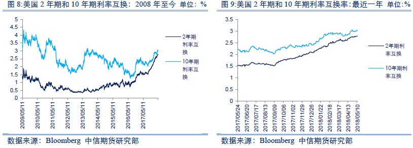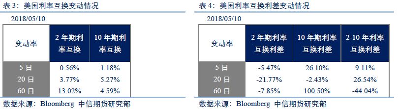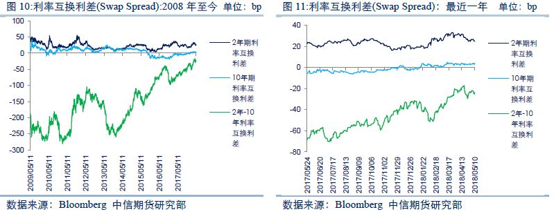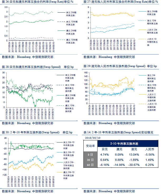 利率互换利差(SwapRate Spread)是利率互换合约与相同期限国债的利差。由于利率互换合约的价格(利率)由浮动利率(Libor)推导得出,而Libor作为大型银行间借贷利率并非无风险,故利率互换合约价格本身也反映了Libor的违约风险溢价(Default Premium)。我们可以通过利率互换合约与国债的价差从一个方面观察市场的信用风险水平。美国国会预算办公室表示美国4月创下史上最大月度预算盈余2140亿美元,创1968年有纪录以来新高,反映出经济活动较去年同期更为强劲。特朗普宣布退出伊朗核协议,原油价格进一步上涨,推升通胀预期。美国10年期国债收益率较上周小幅上涨2bp至2.9622%。2年期利率互换利率和10年期利率互换不同程度小幅上涨,2-10年期利率互换利差走陡9.11%。