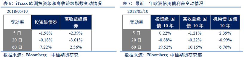 欧洲信用市场观察的角度与美国类似,即货币市场、信用债市场和利率互换市场。本周,英国央行在5月议息会议上维持利率不变,在第一季度经济低迷的情况下,央行的新预测显示,通胀将会更加急剧放缓,并在两年内降至2%的目标。不过英国央行行长卡尼表示最快可能会在今年年底加息。欧洲央行高级官员、比利时央行行长Jan Smets表示,欧洲央行可能会在今年夏季采取措施,逐步结束购债计划,并可能在7月政策会议后公布决定。购债计划可能逐步缩减规模直至零,而不是突然停止;近期的经济增长放缓可能会推迟欧洲央行上调关键利率的时间。欧元2年期和10年期利率互换利率分别上涨2bp和3bp,2-10年利率互换利差走陡1.24%。PIIGS国家方面,德国和意大利的10年期国债收益率利差进一步扩大至1.37%,涨幅显著高于其它国家。早前意大利新政府组阁第四轮磋商失败,现在五星运动和北方联盟有意就组建执政联盟进行最后谈判,这表明意大利反建制政党联合政府或可能上台,意大利政府面临不确定性风险。信用债方面,欧洲投资级债券CDS下跌1.98%,高收益级债券CDS下跌2.39%。