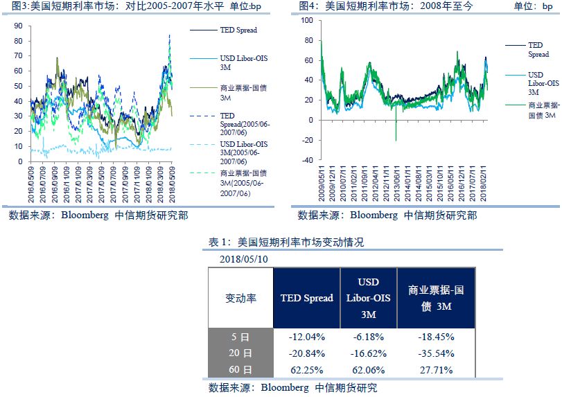 Ted Spread是美元Libor与美国短期国债的利差。美国短期国债具有流动性强和信用高的特点,因而被近似看作“无风险利率”的代表。Ted Spread是信用市场观测的重要指标,其上涨反映了信用市场违约风险的上升。美元Libor与OIS的利差是银行系统的健康指标,反映银行向其他金融机构贷款的意愿。此外,商业票据与短期国债的利差反映了一些信誉良好的公司的信用风险水平。