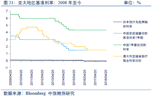 亚太货币市场基准利率各国差异较大(图21)。中国1年期最佳贷款利率是银行体系贷款基准利率,2014年年初开始,该利率出现阶梯式下降,目前已经降至4.35%左右。相较于日本和中国,澳大利亚的货币基准利率2007年1月该利率为6.25%,之后多次下调,2016年8月2日从1.75%降至1.5%。2007年至今的十年间,日本预计无抵押隔夜利率一直在低于1%的水平,2010年以后该利率降至0.1%以下,2016年2月日本央行开始实行负利率。