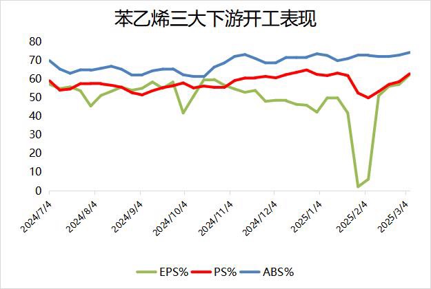 截至3月6日当周,苯乙烯产量微幅增加,三大下游开工率全线上涨