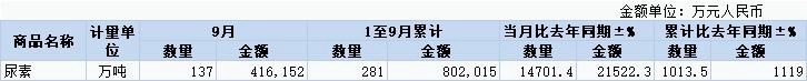 据海关总署,中国9月尿素出口量为137万吨,同比猛增14701.4%。1-9月尿素累计出口量为281万吨,同比增加1013.5%。