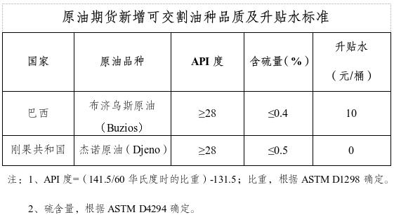 作为新增可交割油种的布济乌斯原油、杰诺原油品质及升贴水标准规定如下: