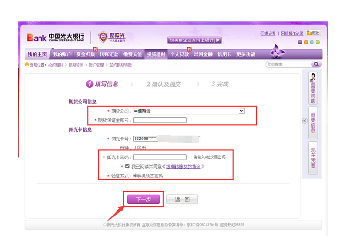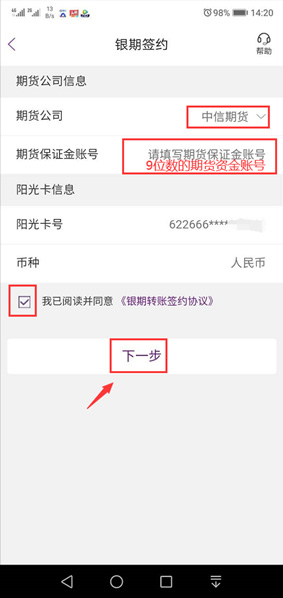选择期货公司,输入保证金照号,输入银行交易密码,勾选“我已阅读“,然后点击下一步。