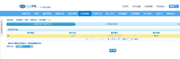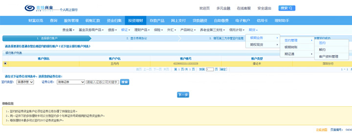 选择“投资理财”-“银证”-“期货”-“银期业务”-“签约管理”-“签约”。
