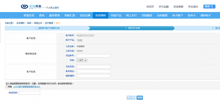 输入期货账号,填写基本信息,勾选“同意”,填写取款密码,点击下一步。