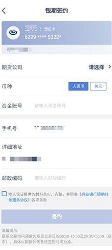 选择“中信期货“,输入资金账号,勾选”本人保证并同意“后点击签约。
