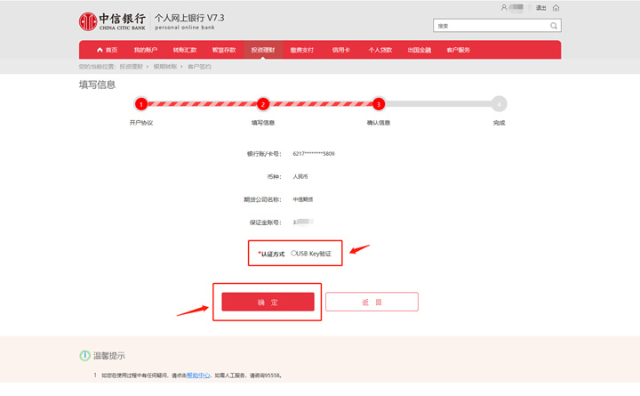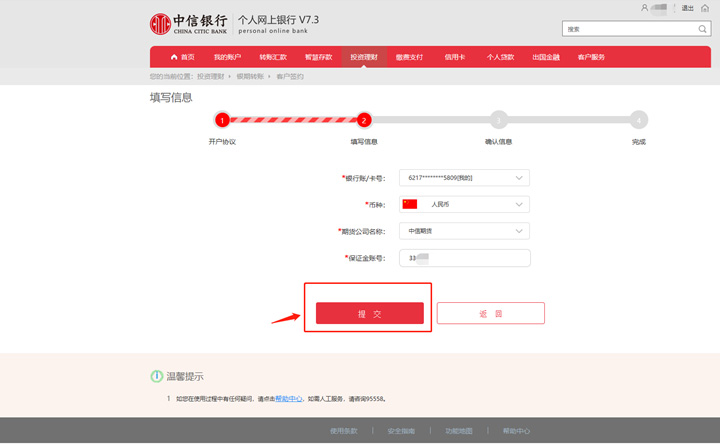 填写信息-期货公司选择中信期货-输入保证金账号-提交。