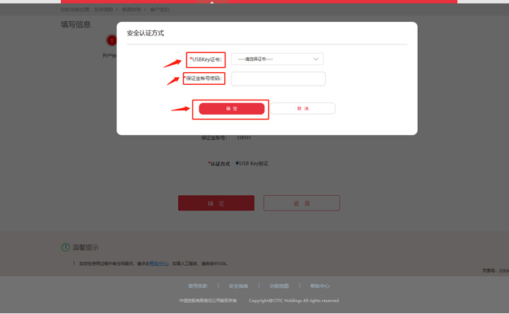 选择USBKEY证书-输入保证金账号密码-确定。