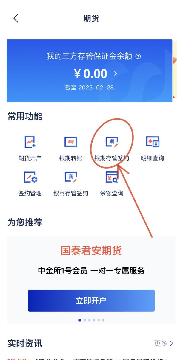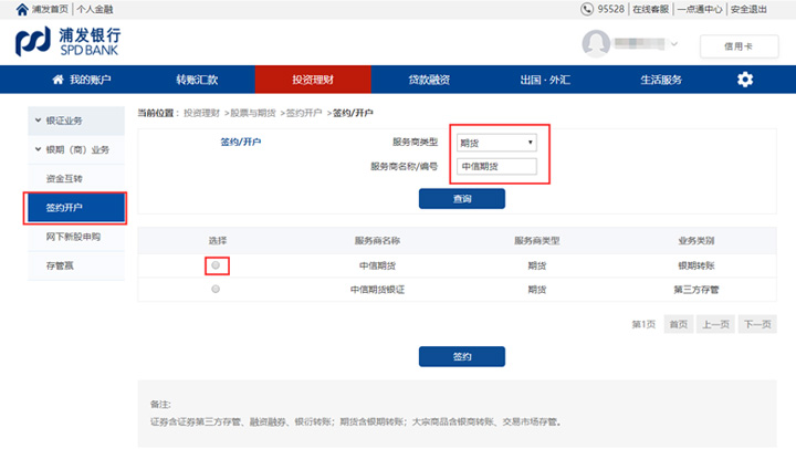 点击签约开户,服务商类型选择“期货“,服务商名称选择”中信期货“,并在底下选择选项上勾选下,再点击”签约“。